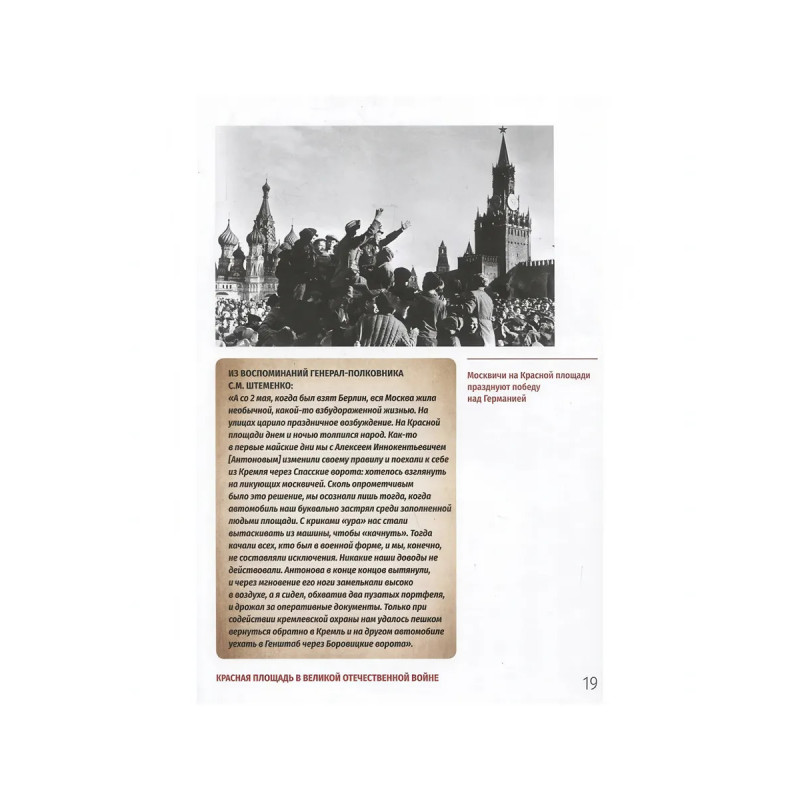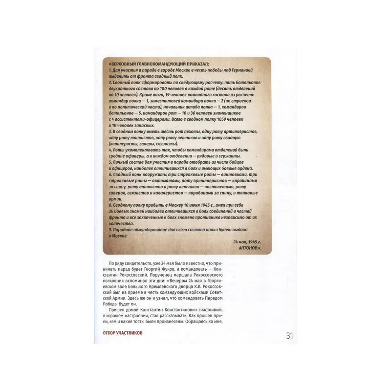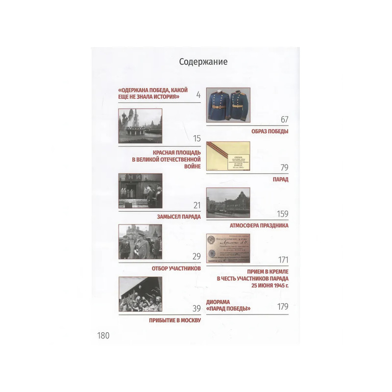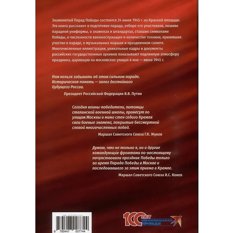 Подарочное издание к 80-летнему юбилею Парада Победы в Москве 24 июня 1945 г. Более 200 фотографий из фондов Российского государственного архива кинофотофонодокументов, Российского государственного архива новейшей истории, других архивов и музеев России. Впервые читателям предоставлен полноценный рассказ о разработке, подготовке и проведении Парада Победы, автором изучены многочисленные документы, рассказывающие о знаменитом параде, что позволило воспроизвести события на Красной площади 24 июня 1945 г. с точностью до минуты.
