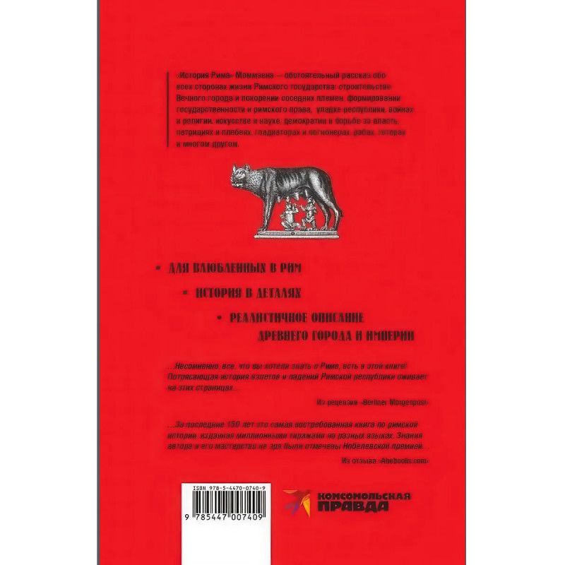Бестселлер знаменитого германского историка Теодора Моммзена (1817-1903) был удостоен Нобелевской премии по литературе в 1902 г. и затем переведен практически на все европейские языки. "История Рима" Моммзена - обстоятельный рассказ обо всех сторонах жизни Римского государства: строительстве Вечного города и покорении соседних племен, формировании государственности и римского права, упадке республики, войнах и религии, искусстве и науке, демократии и борьбе за власть, патрициях и плебеях, гладиаторах и легионерах, рабах, гетерах и многом другом. За описанием событий римской истории встают яркие образы Цицерона и Цезаря, Ганнибала и Митридата, Тиберия и Гая Гракхов.