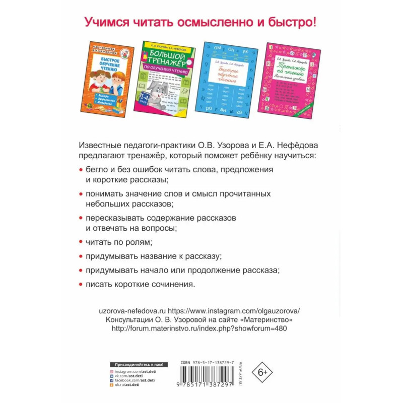 О чем эта книгаПособие известных педагогов-практиков О. В. Узоровой и Е. А. Нефёдовой поможет ребёнку научиться читать слова, предложения и короткие рассказы.Кому эта книга будет интереснаПервоклассникам, а также учащимся 2-4 классов.Каковы особенности этой книги Отличное пособие для обучения чтению. В книге даны упражнения и задания, которые помогут ребёнку научиться читать, а также понимать значение слов, смысл прочитанных небольших рассказов, отвечать на вопросы, пересказывать их содержание. Книга будет полезна первоклассникам, а также учащимся 2-4 классов.