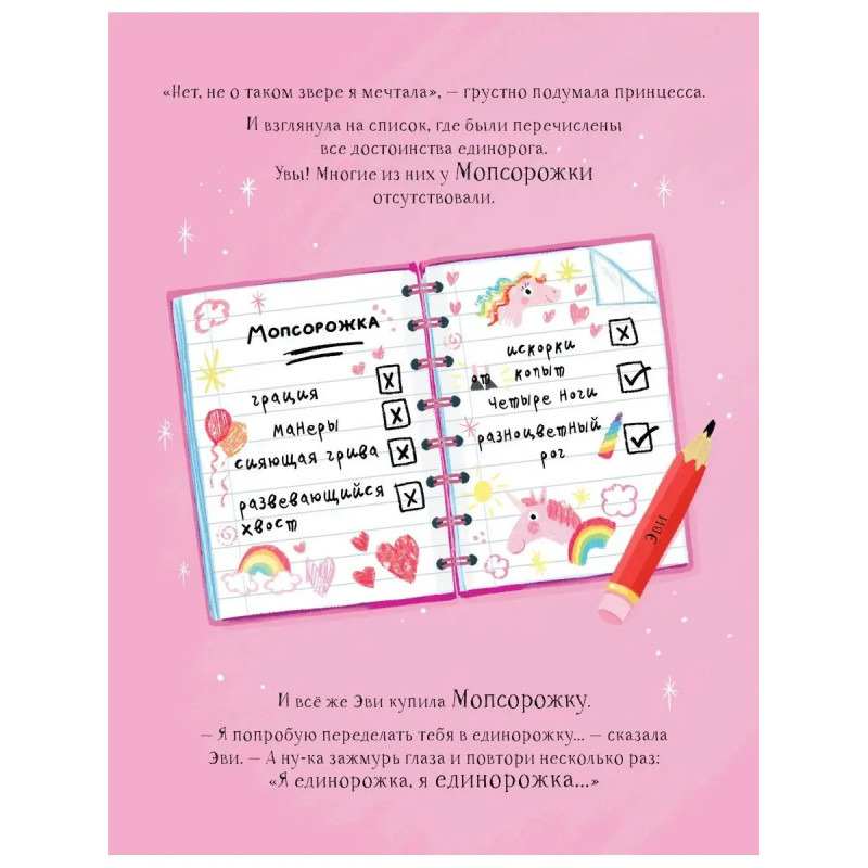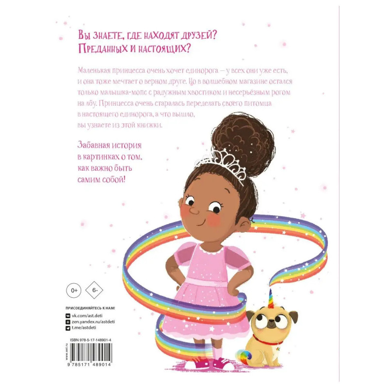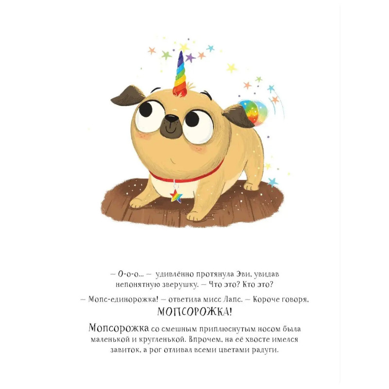 Все принцы и принцессы уже давно обзавелись единорогами, только принцессе Мие досталась странная Мопсорожка, у которой нет ни сияющих копыт, ни роскошной гривы - только радужный хвостик и маленький рог на лбу. Зато именно она выручает всех из беды и становится для Мии настоящим другом. Эта забавная история в картинках расскажет детям о том, как важно быть самим собой!