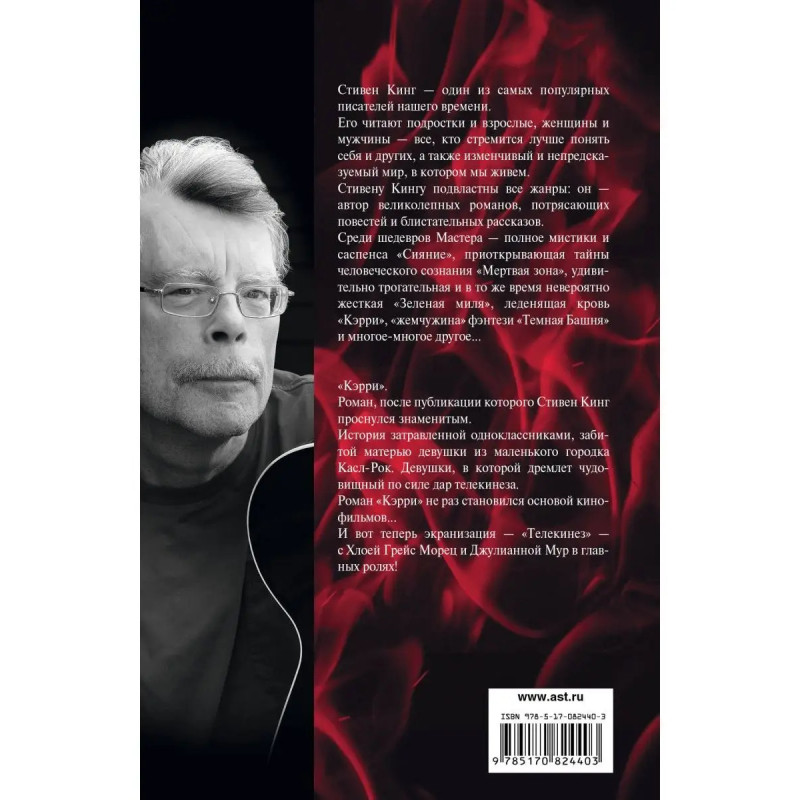 "Кэрри". Роман, после публикации которого Стивен Кинг проснулся знаменитым. История затравленной одноклассниками, забитой матерью девушки из маленького городка Касл-Рок. Девушки, в которой дремлет чудовищный по силе дар телекинеза. Роман "Кэрри" неоднократно экранизировалась. И вот теперь новая экранизация - "Телекинез" - с Хлоей Грейс Морец и Джулианной Мур в главных ролях!
