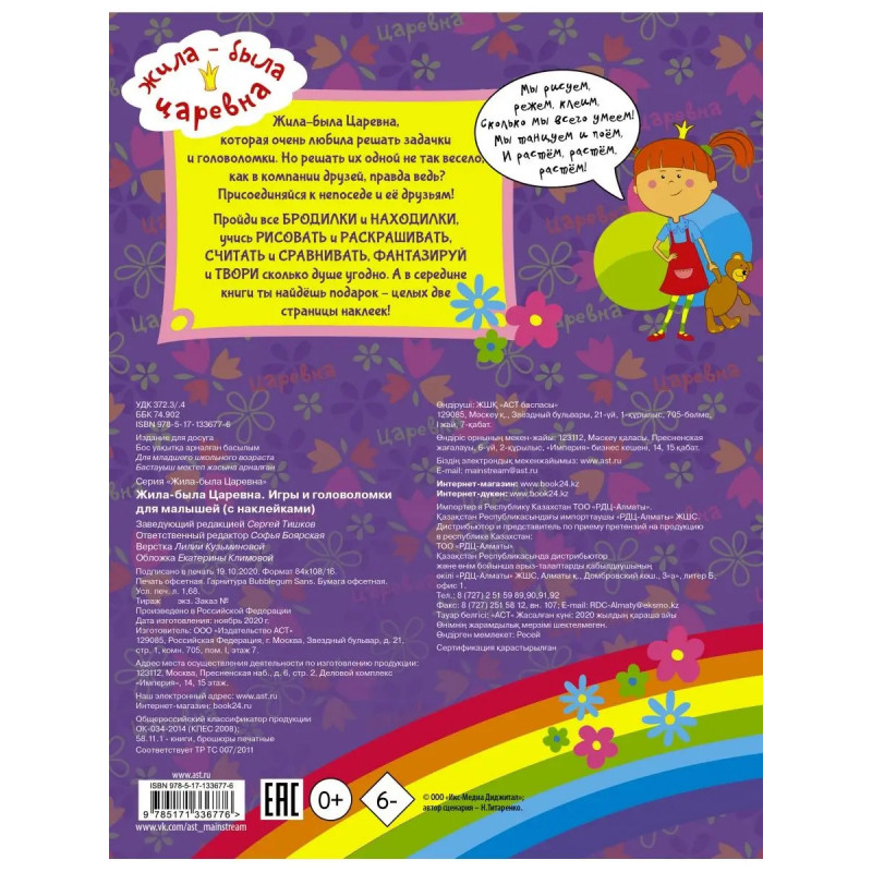 Жила-была Царевна, которая очень любила решать задачки и головоломки. Но решать их одной не так весело, как в компании друзей, правда ведь? Присоединяйся к непоседе и её друзьям! Пройди все бродилки и находилки, учись рисовать и раскрашивать, считать и сравнивать, фантазируй и твори сколько душе угодно. А в середине книги ты найдёшь подарок целых две страницы наклеек!