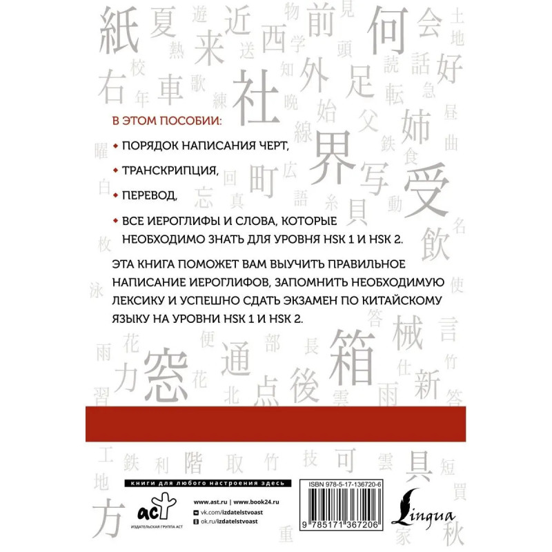 В этой рабочей тетради по китайскому языку даётся порядок написания черт, транскрипция и перевод основных иероглифов, которые входят в обязательный минимум для уровней HSK 1-2. Пособие поможет выучить правильное написание иероглифов, запомнить необходимую лексику и успешно сдать экзамен по китайскому языку. Книга адресована тем, кто только начинает изучать китайский язык и стремится к совершенству.
