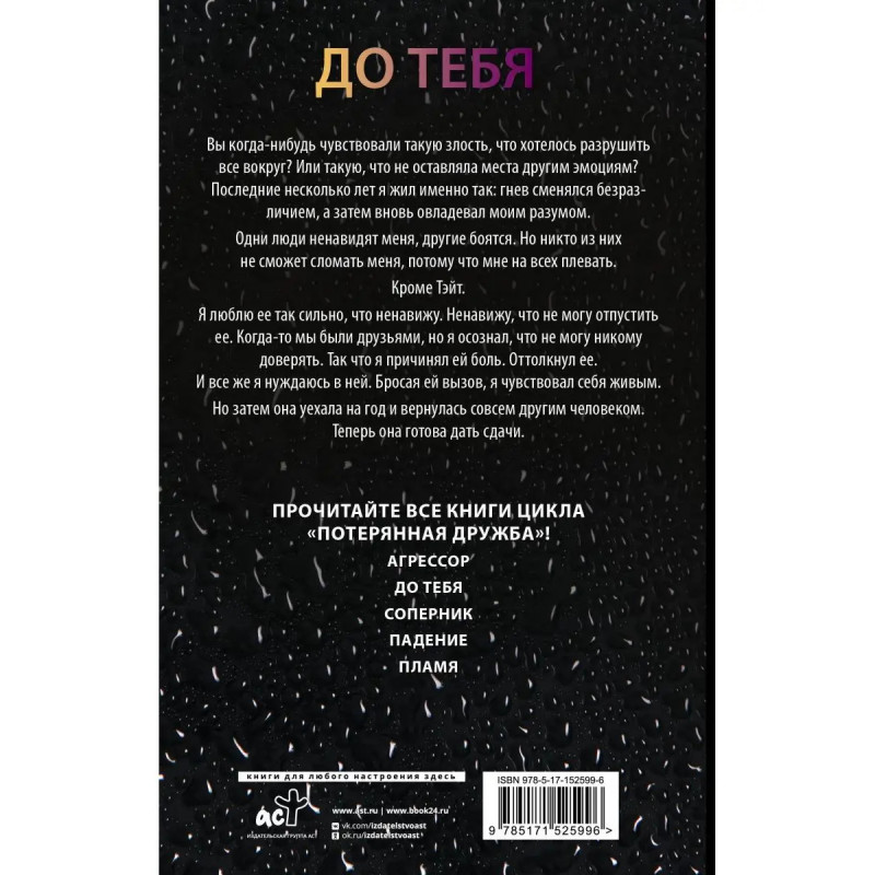 От автора бестселлеров по версии New York Times, USA Today и Wall Street Journal. Вторая книга цикла The Fall Away. Продолжение романа Агрессор. Вы уже знаете историю Тейт. А теперь прочтите версию Джареда. Взрывная романтическая серия Пенелопы Дуглас переизобретает понятия того, что значит влюбиться по уши. Роман До тебя выходит в двух вариантах оформления.
