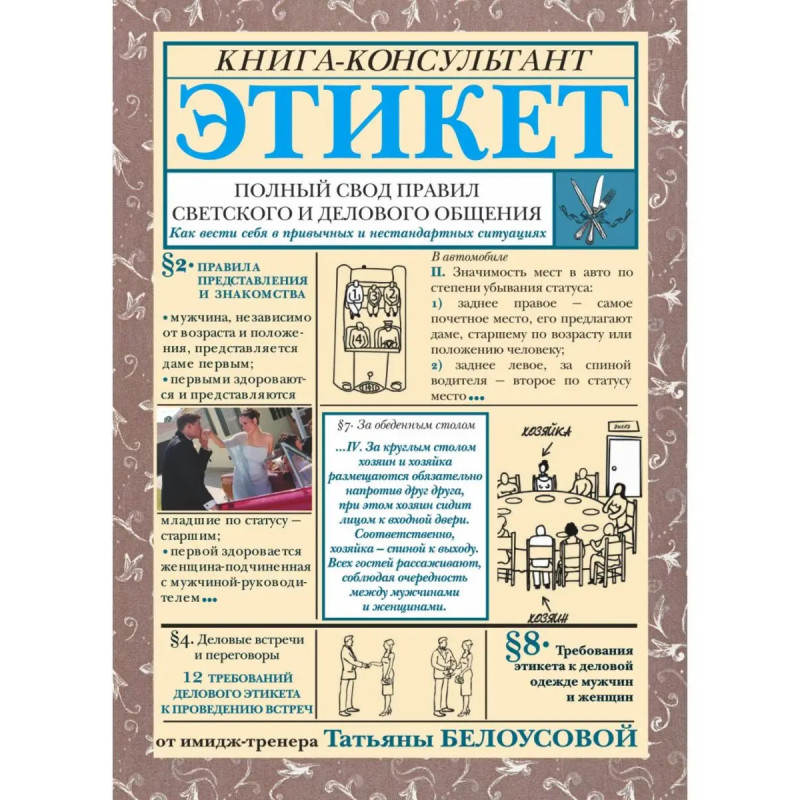 Как одеться на торжественный ужин? Как правильно пользоваться столовыми приборами? На какое место в автомобиле посадить важного гостя? Как рассадить партнеров для успешных деловых переговоров? Ответы на эти и многие другие вопросы, связанные с исключительными событиями и повседневным общением, вы найдете в этом справочнике. "Сложные" и "трудновыполнимые" правила этикета окажутся простыми и понятными, а следование им сделает вашу жизнь легче и приятнее. Книга написана известным имидж-тренером, стилистом и психологом Татьяной Белоусовой.