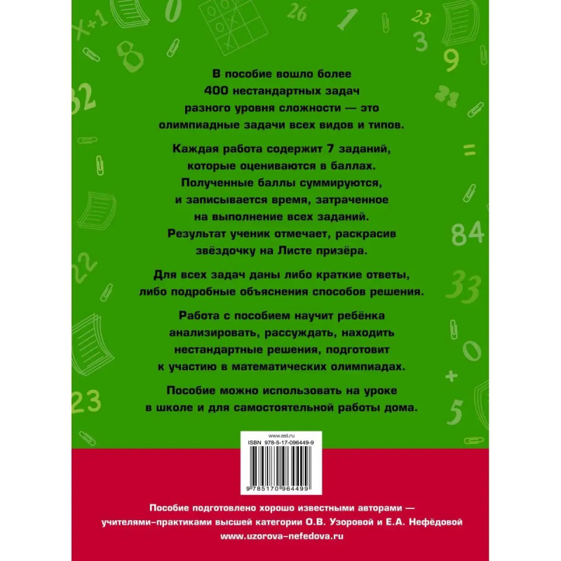 Новая книга известных педагогов-практиков О.В. Узоровой и Е.А. Нефёдовой содержит более 400 нестандартных задач разного уровня сложности. Для всех задач даны либо краткие ответы, либо подробные объяснения способов решения. Работа с пособием научит ребёнка анализировать, рассуждать, находить нестандартные решения, подготовит к участию в математических олимпиадах.Пособие можно использовать на уроке в школе и для самостоятельной работы дома.