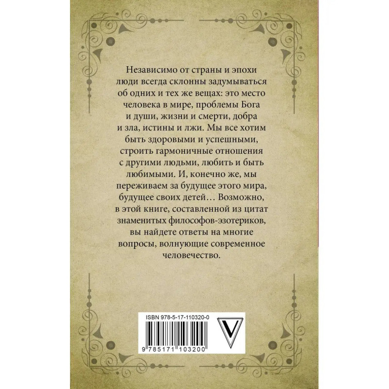 Независимо от страны и эпохи люди всегда склонны задумываться об одних и тех же вещах: это место человека в мире, проблемы Бога и души, жизни и смерти, добра и зла, истины и лжи. Мы все хотим быть здоровыми и успешными, строить гармоничные отношения с другими людьми, любить и быть любимыми. И, конечно же, мы переживаем за будущее этого мира, будущее своих детей Возможно, в этой книге, составленной из цитат знаменитых философов-эзотериков, вы найдете ответы на многие вопросы, волнующие современное человечество.