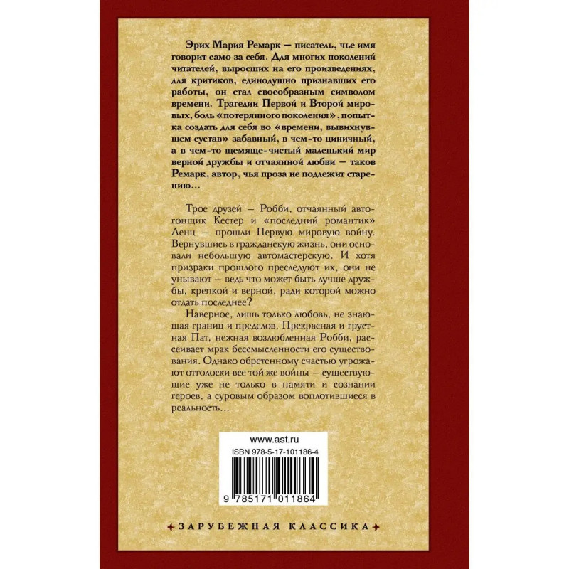 Трое друзей Робби, отчаянный автогонщик Кестер и "последний романтик" Ленц прошли Первую мировую войну. Вернувшись в гражданскую жизнь, они основали небольшую автомастерскую. И хотя призраки прошлого преследуют их, они не унывают ведь что может быть лучше дружбы, крепкой и верной, ради которой можно отдать последнее? Наверное, лишь только любовь, не знающая границ и пределов. Прекрасная и грустная Пат, нежная возлюбленная Робби, рассеивает мрак бессмысленности его существования. Однако обретенному счастью угрожают отголоски все той же войны существующие уже не только в памяти и сознании героев, а суровым образом воплотившиеся в реальность...