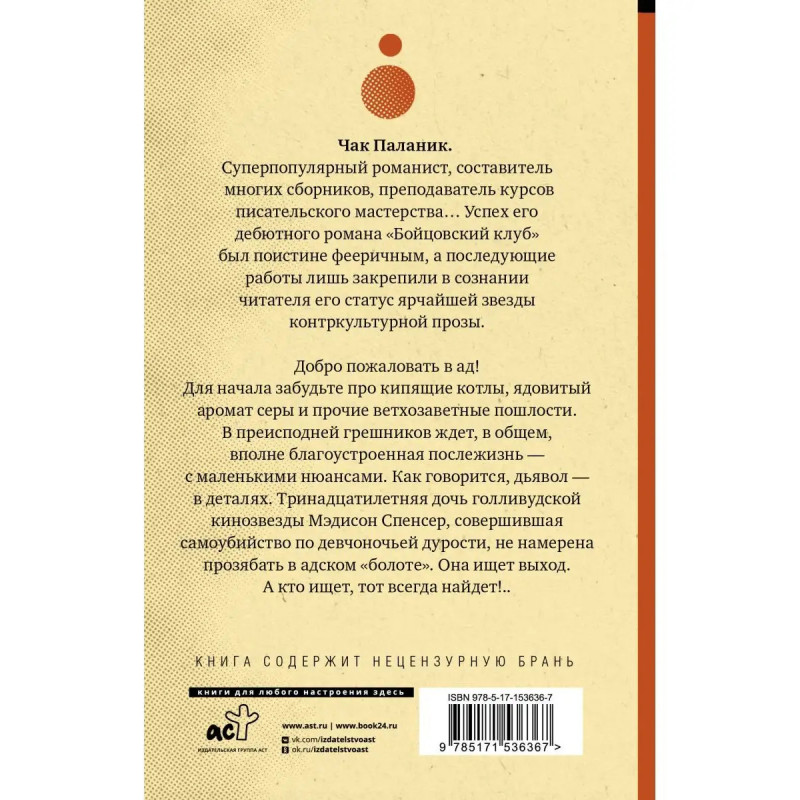 Чак Паланик. "Сумасшедший гений" не "поколения Икс", но поколения СЛЕДУЮЩЕГО. Автор, чьи романы "Удушье", "Колыбельная", "Уцелевший" и "Невидимки" снискали славу КУЛЬТОВОЙ классики современной альтернативной прозы. Автор, который ДЕЙСТВИТЕЛЬНО "взорвал мир" своим легендарным "Бойцовским клубом". Чак Паланик. Писатель, которого уже называют Уильямом Берроузом нашего времени. Добро пожаловать в ад! Для начала, забудьте про кипящие котлы, ядовитый аромат серы и прочие ветхозаветные пошлости. В преисподней грешников ждет, в общем, вполне благоустроенная послежизнь, - с маленькими нюансами. Как говорится, "дьявол в деталях". Тринадцатилетняя дочь голливудской кинозвезды Мэдисон Спенсер, совершившая самоубийство по девчоночьей дурости, не намерена прозябать в адском "болоте". Она ищет выход. А кто ищет, тот всегда найдет!..