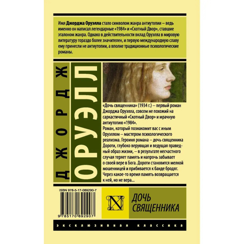 "Дочь священника" роман совсем не похожий на саркастичный "Скотный Двор" и мрачную антиутопию "1984". Роман, который познакомит вас и иным Оруэллом мастером психологического реализма. Героиня романа дочь священника Дороти, глубоко верующая и ведущая праведный образ жизни, в результате несчастного случая теряет память и напрочь забывает о своей вере в Бога. Дороти становится мелкой мошенницей и прибивается к банде бродяг. Через какое-то время память возвращается к ней, но не вера...