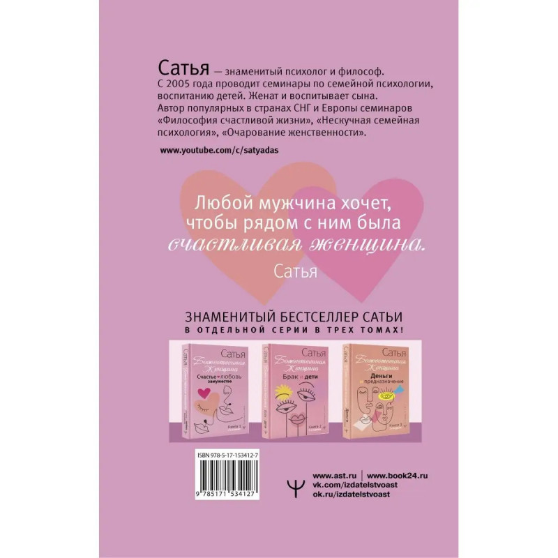 Нас с детства учат, что эгоизм это пл.оxо, что желания окружающих должны быть на первом месте, а жить надо "для совести, а не для радости". Именно эти установки не дают женщине следовать ее истинным желаниям, раскрывать женскую сущность. Сотни книг учат, как быть идеальной женой, мамой и хозяйкой. И только одна скажет правду: божественная женщина не та, которая удобна, а та, которая счастлива. Это книга знаменитого семейного психолога, философа, автора бестселлеров Сатьи. В ней он дает советы, которые помогут вам избавиться от неправильных установок о роли женщины, найти и выбрать достойного человека, создать крепкую семью. Эта книга поднимает самооценку и помогает женщине понять, что делает ее красивой, здоровой, любимой, а значит и счастливой.