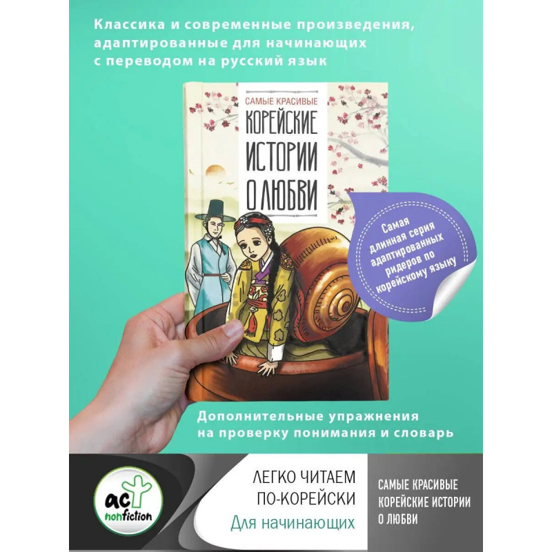 Учебное пособие по домашнему чтению "Самые красивые корейские истории о любви" предназначено для тех, кто изучает корейский язык. Оно включает адаптированные народные сказки, исторические легенды и забавные истории ("Ёни и Подыльип", "Девушка-улитка", "Жених-змей"). Это пособие продолжает серию учебных материалов, в основу которых положены произведения устного народного творчества. Каждый текст снабжен корейско-русским словарем, облегчающим чтение, вопросами и упражнениями для проверки понимания прочитанного и закрепления новых слов. Также прилагаются художественный перевод на русский язык и ключи к упражнениям. Тексты отобраны и адаптированы для начинающих изучать корейский язык ведущими преподавателями корейского языка и литературы ИСАА МГУ Чун Ин Сун и Ириной Львовной Касаткиной.