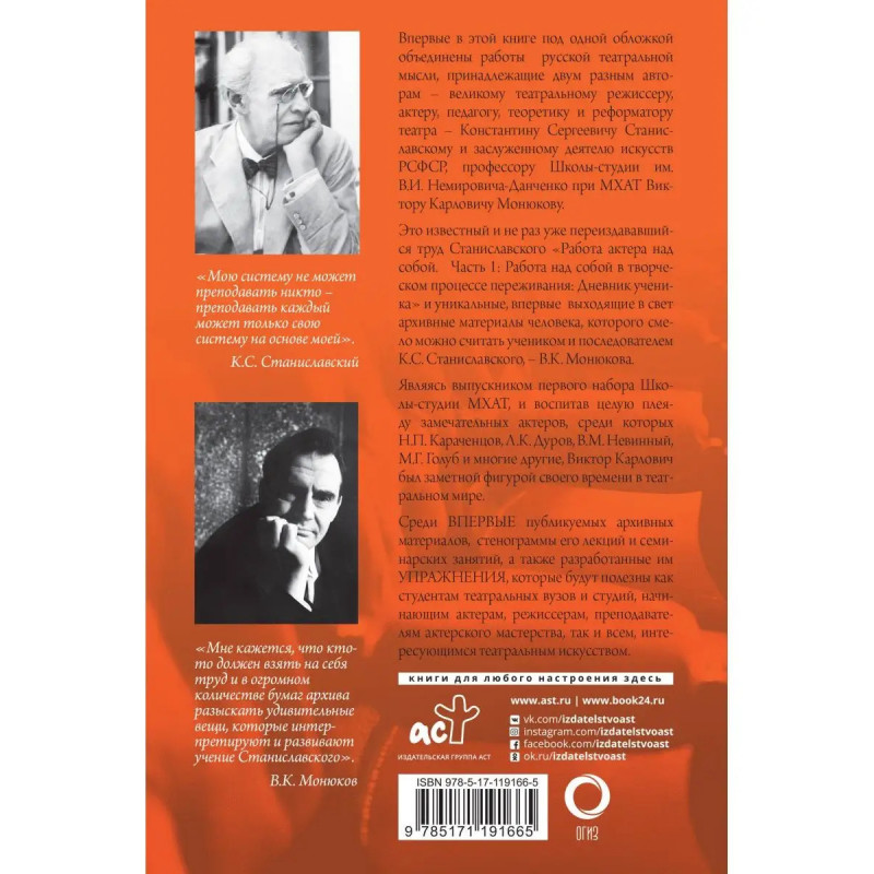 Впервые в этой книге под одной обложкой собрано два уникальных произведения русской театральной мысли, принадлежащие двум разным авторам Константину Сергеевичу Станиславскому (18631938) и Виктору Карловичу Монюкову (19241984). Это знаменитый и переиздававшийся уже не раз труд Станиславского "Работа актера над собой. Часть 1: Работа над собой в творческом процессе переживания: Дневник ученика", и впервые выходящие в свет уникальные архивные материалы человека, которого можно смело считать учеником и последователем К.С. Станиславского В.К. Монюкова. На протяжении многих лет он вел семинарские занятия для преподавателей театральных школ Советского Союза и читал лекции по наследию Станиславского в стране и за рубежом. Мы публикуем статьи, выдержки из дневников, отчеты о командировках, и главное стенограммы лекций, семинарских занятий разных лет и авторские упражнения В.К. Монюкова, созданные им на основе системы Станиславского, ведь как писал сам Константин Сергеевич "Мою систему не может преподавать н