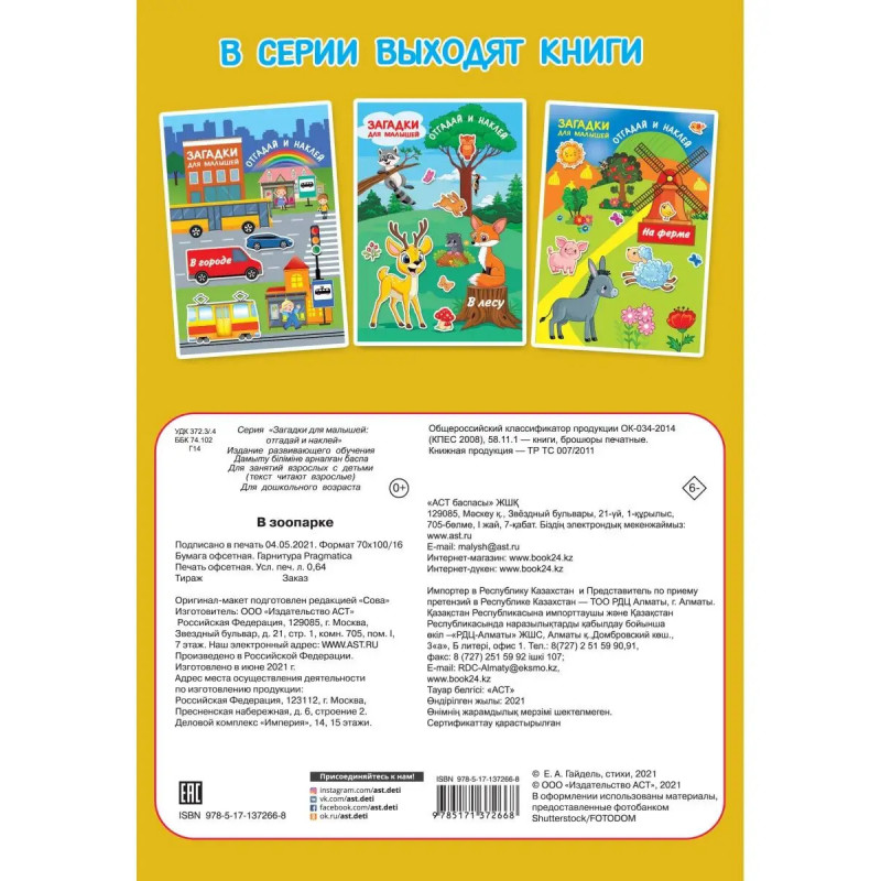 О чем эта книга Прекрасно иллюстрированная книга загадок о животных зоопарка для любознательных малышей. Отгадывать загадки и выполнять задания в картинках любимое занятие ребят + игра для развития речи, внимания, памяти, воображения. Внимательно послушать загадку и найти на поле наклеек картинку-отгадку весело, интересно, познавательно. Кому эти книги будут интересны Весёлые загадки и задания в картинках для знакомства с миром живой природы. Каковы особенности этих книг С нашей книжкой ребенок выучит названия животных обитателей зоопарка. На каждой странице книги яркие, динамичные цветные рисунки. Очень интересно послушать и выучить наизусть весёлые загадки, и конечно, правильно подбирать отгадки и находит их среди наклеек. Можно устраивать викторину загадок вместе с друзьями или со взрослыми. Загадки развивают образное внимание, логическое и абстрактное мышление, память и речь малыша, а также расширяют его кругозор. С нашей книжкой разучивание загадок и поиск наклеек-отгадок пр