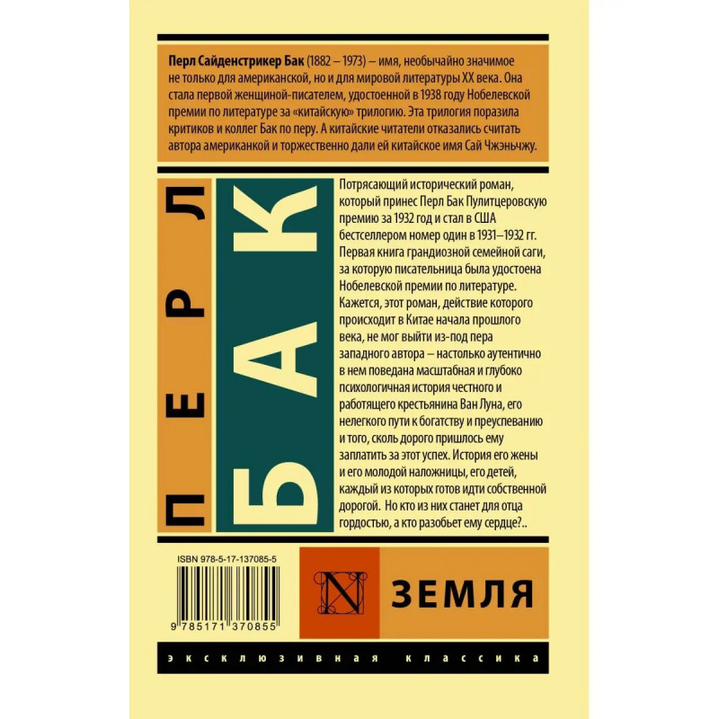 Потрясающий исторический роман, который принес Перл Бак Пулитцеровскую премию за 1932 год и стал в США бестселлером номер один в 19311932 гг. Первая книга грандиозной семейной саги, за которую писательница была удостоена Нобелевской премии по литературе. Кажется, этот роман, действие которого происходит в Китае начала прошлого века, не мог выйти из-под пера западного автора настолько аутентично в нем поведана масштабная и глубоко психологичная история честного и работящего крестьянина Ван Луна, его нелегкого пути к богатству и преуспеванию и того, сколь дорого пришлось ему заплатить за этот успех. История его жены и его молодой наложницы, его детей, каждый из которых готов идти собственной дорогой. Но кто из них станет для отца гордостью, а кто разобьет ему сердце?..