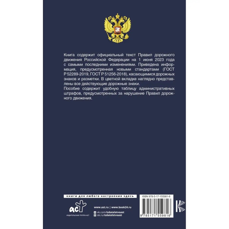Книга содержит официальный текст Правил дорожного движения Российской Федерации на 1 июня 223 года, включая правила пользования средствами индивидуальной мобильности (электросамокатами, электроскейтбордами, гироскутерами, сигвеями, моноколесами и иными аналогичными средствами). В цветной вкладке наглядно представлены все действующие дорожные знаки. Пособие содержит удобную таблицу административных штрафов, предусмотренных за нарушение Правил дорожного движения.