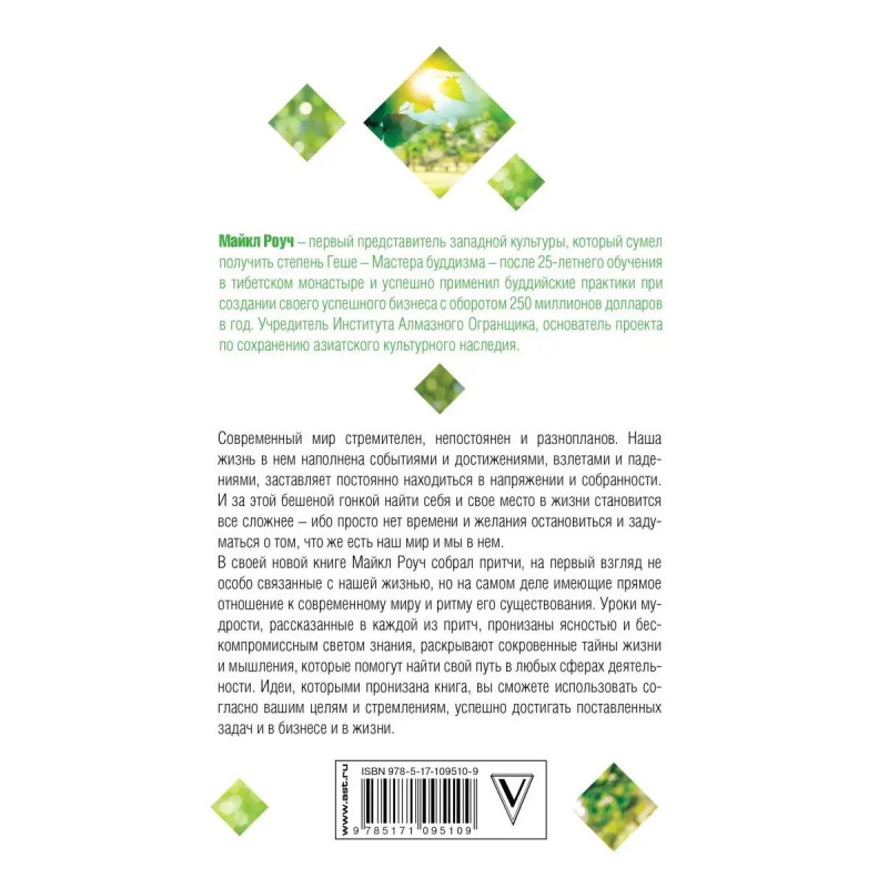 Современный мир стремителен, непостоянен и разнопланов. Наша жизнь в нем наполнена событиями и достижениями, взлетами и падениями, заставляет постоянно находиться в напряжении и собранности. И за этой бешеной гонкой найти себя и свое место в жизни становится все сложнее ибо просто нет времени и желания остановиться и задуматься о том, что же есть наш мир и мы в нем. В своей новой книге Майкл Роуч собрал притчи, на первый взгляд не особо связанные с нашей жизнью, но на самом деле имеющие прямое отношение к современному миру и ритму его существования. Уроки мудрости, рассказанные в каждой из притч, пронизаны ясностью и бескомпромиссным светом знания, раскрывают сокровенные тайны жизни и мышления, которые помогут найти свой путь в любых сферах деятельности. Идеи, которыми пронизана книга, вы сможете использовать согласно вашим целям и стремлениям, успешно достигать поставленных задач и в бизнесе и в жизни.