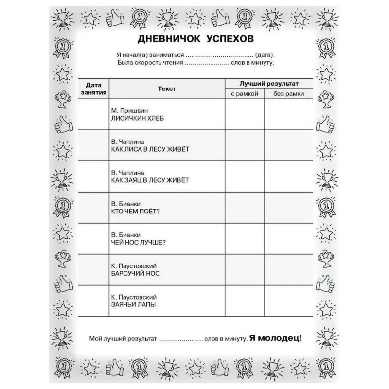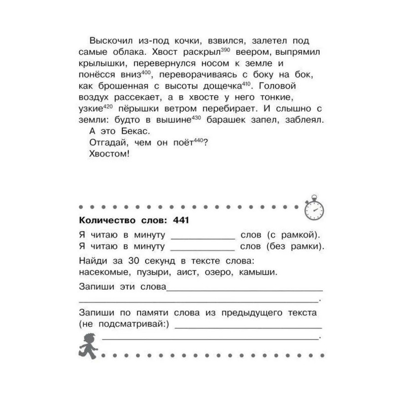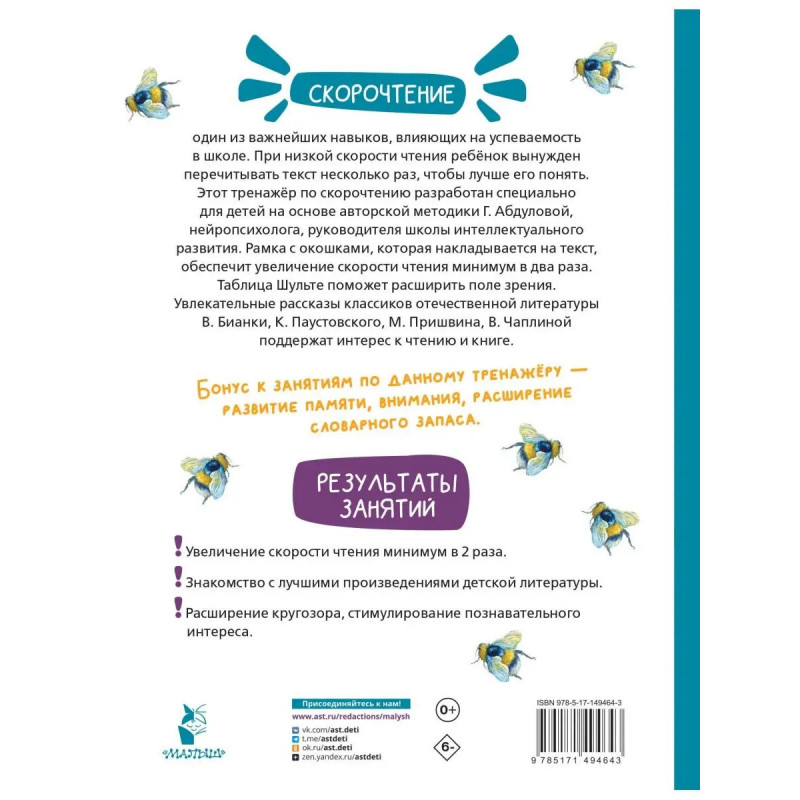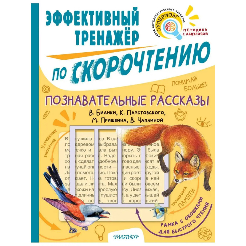 7 причин купить книгу: - Увеличение скорости чтения минимум в два раза. - Знакомство с лучшими произведениями детской литературы. - Развитие памяти, внимания, познавательного интереса, увеличение словарного запаса. - Таблица Шульте для расширения поля зрения. - Специальная рамка с окошками, которая накладывается на текст, и позволяет значительно улучшить технику чтения. - Занятия по авторской методике Г. Абдуловой, нейропсихолога, руководителя школы интеллектуального развития, - Тренировка одного из самых важных навыков для успешного обучения в школе.