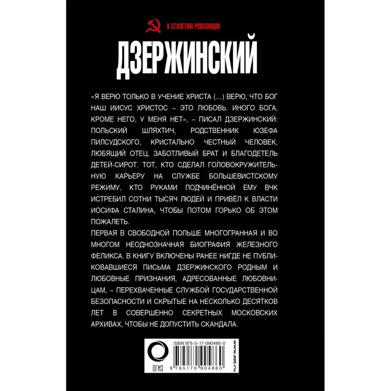 Я верю только в учение Христа () Верю, что Бог наш Иисус Христос это любовь. Иного Бога, кроме него, у меня нет писал Дзержинский: польский шляхтич, родственник Юзефа Пилсудского, кристально честный человек, любящий отец, заботливый брат и благодетель детей-сирот. Тот, кто сделал головокружительную карьеру на службе большевистскому режиму, кто руками подчинённой ему ВЧК истребил сотни тысяч людей и привёл к власти Иосифа Сталина, чтобы потом горько об этом пожалеть. Первая в свободной Польше многогранная и во многом неоднозначная биография Железного Феликса. В книгу включены ранее нигде не публиковавшиеся письма Дзержинского родным и любовные признания, адресованные любовницам - перехваченные службой государственной безопасности и скрытые на несколько десятков лет в совершенно секретных московских архивах, чтобы не допустить скандала.