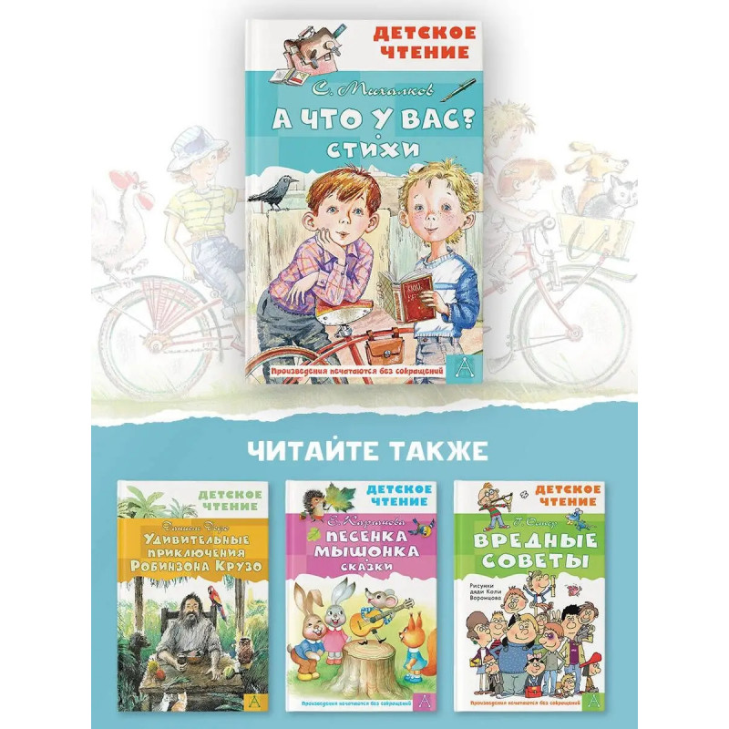 Сергей Михалков знаменитый поэт, писатель, автор Гим- на России. В книгу "А что у вас?" вошли самые знаменитые стихотворения Сергея Михалкова для детей школьного возрас- та. Школьная пора очень интересное время: новые открытия, новые друзья, новые знания и, конечно, новые проказы. Сергей Михалков очень точно передаёт чувства и переживания детей, показывает им, как они выглядят со стороны, смеётся вместе с ними и мечтает. Помечтайте и вы вместе с героями этого вели- колепного сборника стихов! Для среднего школьного возраста.