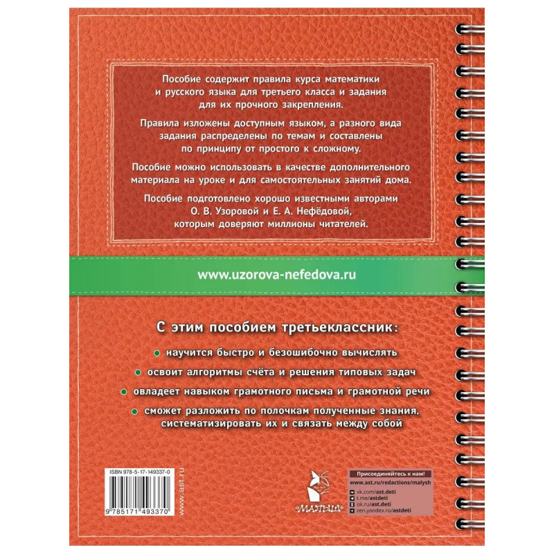 Хотите помочь ребёнку лучше учиться и систематизировать свои знания?Это пособие содержит правила курса русского языка и математики для третьего класса и задания для их прочного закрепления. Правила изложены доступным языком, а разного вида задания распределены по темам и составлены по принципу от простого к сложному. Пособие составлено экспертами детского образования, которым доверяют миллионы О.В. Узоровой и Е.А. Нефёдовой.С этим пособием третьеклассник научится быстро и безошибочно вычислять, освоит алгоритмы решения типовых задач, овладеет навыком грамотного письма и грамотной речи. Ребёнок сможет разложить по полочкам полученные знания, систематизировать их и связать между собой.Помогите ребёнку ходить в школу с радостью!