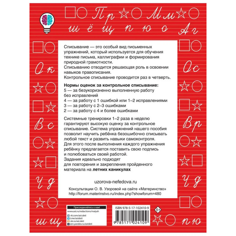 Это сборник заданий для контрольного списывания, разработанный известными педагогами-практиками О.В. Узоровой и Е.А. Нефёдовой. Книга адресована учащимся начальных классов. - Выполняя упражнения, ученик тренирует важные учебные навыки - осваивает орфографическое чтение,графические навыки, устное списывание, изучает правила русского языка, учится безошибочно списывать любой текст, развивает навык самоконтроля. - Учебное пособие можно использовать для работы в классе и дома по всем федеральным программам начальной школы. - Задания этой книги идеально подходят для повторения и закрепления пройденного материала на летних каникулах. - 20 минут занятий по этой книге в день помогут развить память, внимание и орфографическую зоркость - ребёнок научится безукоризненно выполнять упражнения по русскому языку.