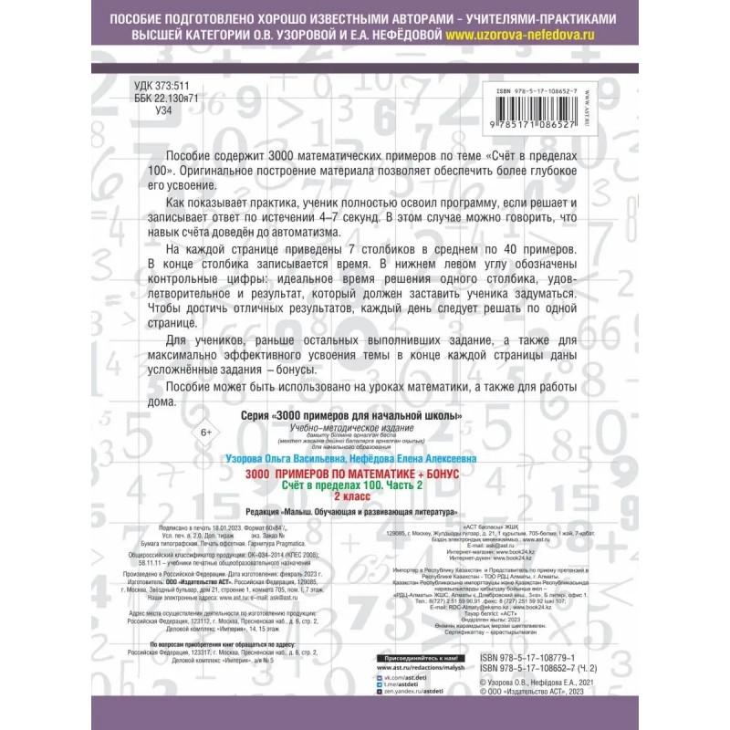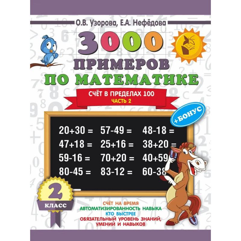 В пособие включены примеры по базовой теме курса математики для начальной школы Счёт в пределах 100.Как показывает практика, ученик полностью освоил программу, если решает и записывает ответ по истечении 4-7 секунд. В этом случае можно говорить, что навык счёта доведен до автоматизма. Оригинальное построение материала пособия позволяет обеспечить более глубокое его усвоение и помогает отработать навык счета до автоматизма. Пособие можно использовать для работы в классе и самостоятельных занятий дома.О. В. Узорова и Е.А Нефёдова известные педагоги-практики, авторы самых издаваемых учебников и учебных пособий в России. Основанные на авторской методике, доказавшей свою эффективность миллионными тиражами, эти пособия помогут родителям подготовить ребенка к школе, а ученикам легко и эффективно освоить программу начальной школы. Все, что поможет ребенку стать успешным в учёбе, вы найдёте в книгах Узоровой и Нефёдовой: развитие речи, тексты для 2 класса, контрольное списывание, диктанты по русскому язы