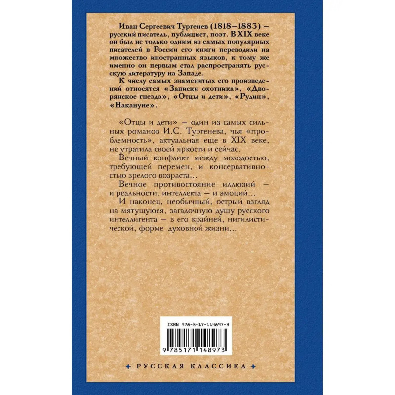 "Отцы и дети" один из самых сильных романов И.С. Тургенева, чья "проблемность", актуальная еще в XIX веке, не утратила своей яркости и сейчас. Вечный конфликт между молодостью, требующей перемен, и консервативностью зрелого возраста... Вечное противостояние иллюзий и реальности, интеллек- та и эмоций... И наконец, НЕОБЫЧНЫЙ, острый взгляд на мятущуюся, загадочную душу русского интеллигента в его крайней, нигилистической форме духовной жизни...