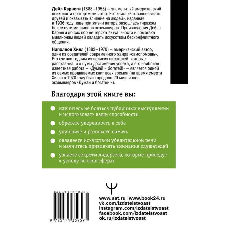 Два бестселлера в одной книге! Вы хотите научиться разговаривать так, чтобы собеседник полностью проникся вашей идеей? Вы хотите, чтобы о вас говорили как о привлекательном человеке? Деловые переговоры, выступления перед аудиторией или общение с начальником или любимым человеком их результаты, как правило, зависят от вашего умения говорить. Как выстроить свою речь? С чего начать? Как сказать о главном? Как понравиться? На эти вопросы ответят два самых авторитетных автора, два человека, которые заслужили признание и уважение миллионов людей по всему миру, Дейл Карнеги и Наполеон Хилл. В этой книге вас ждут яркие примеры, поучительные истории, а также вопросы и задания, которые позволят вам при любых обстоятельствах держаться уверенно, говорить убедительно и вызывать восхищение.
