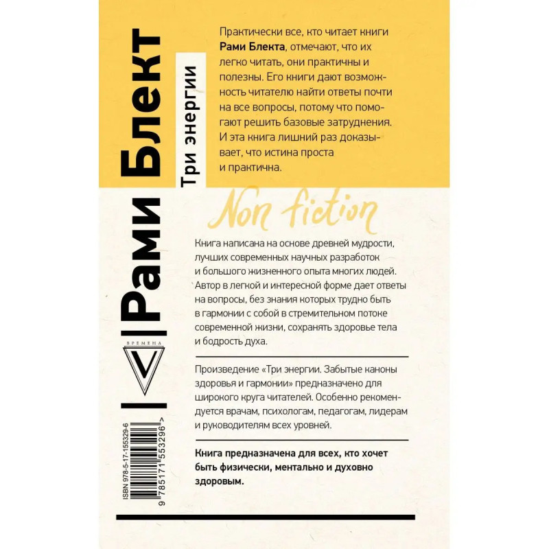 Практически все, кто читает книги Рами Блекта, отмечают, что их легко читать, они практичны и полезны. Его книги дают возможность читателю найти ответы почти на все вопросы, потому что помогают решить базовые затруднения. И эта книга лишний раз доказывает, что истина проста и практична. Книга написана на основе древней мудрости, лучших современных научных разработок и большого жизненного опыта многих людей. Автор в легкой и интересной форме дает ответы на вопросы, без знания которых трудно быть в гармонии с собой в стремительном потоке современной жизни, сохранять здоровье тела и бодрость духа. Произведение "Три энергии. Забытые каноны здоровья и гармонии" предназначено для широкого круга читателей. Особенно рекомендуется врачам, психологам, педагогам, лидерам и руководителям всех уровней. Книга предназначена для всех, кто хочет быть физически, ментально и духовно здоровым.