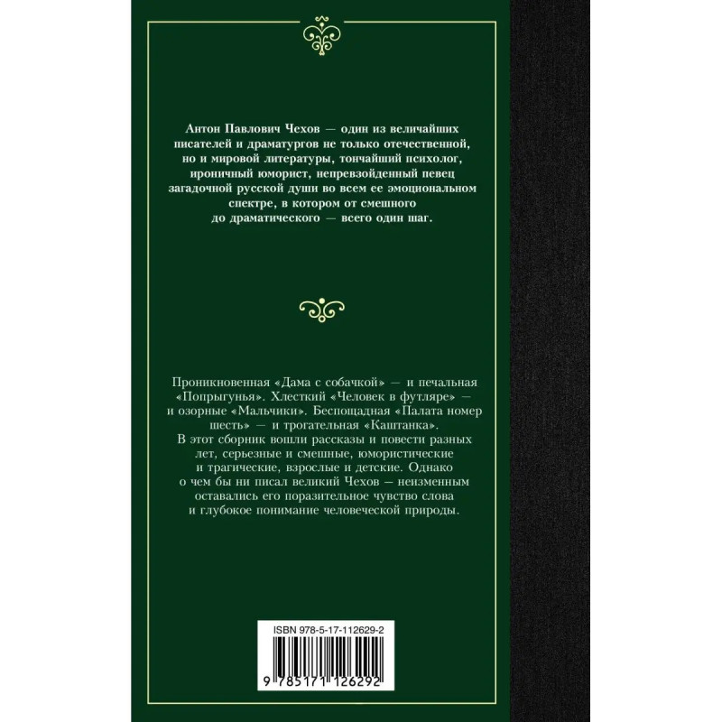 Проникновенная "Дама с собачкой" и печальная "Попрыгунья". Хлесткий "Человек в футляре" и озорные "Мальчики". Беспощадная "Палата номер шесть" и трогательная "Каштанка". В этот сборник вошли рассказы и повести разных лет, серьезные и смешные, юмористические и трагические, взрослые и детские. Однако о чем бы ни писал великий Чехов неизменными всегда оставались его поразительное чувство слова и глубокое понимание человеческой природы.