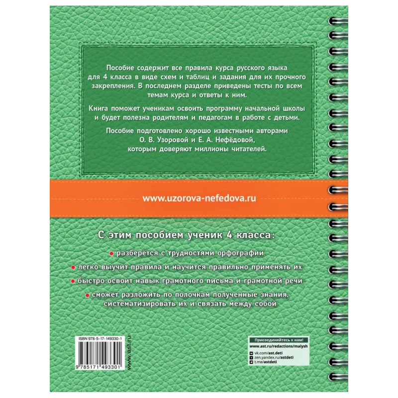Хотите помочь ребёнку лучше учиться и систематизировать свои знания?Это пособие содержит все правила курса русского языка для четвертого класса в виде схем и таблиц и задания для их прочного закрепления. В последнем разделе приведены тесты по всем темам курса и ответы к ним. Пособие составлено экспертами детского образования, которым доверяют миллионы О.В. Узоровой и Е.А. Нефёдовой.С этим пособием первоклассник легко выучит правила и научится правильно применять их, быстро освоит навык грамотного письма и грамотной речи. Ребёнок сможет разложить по полочкам полученные знания, систематизировать их и связать между собой.Помогите ребёнку ходить в школу с радостью!