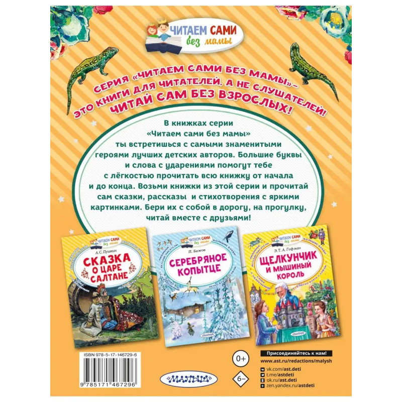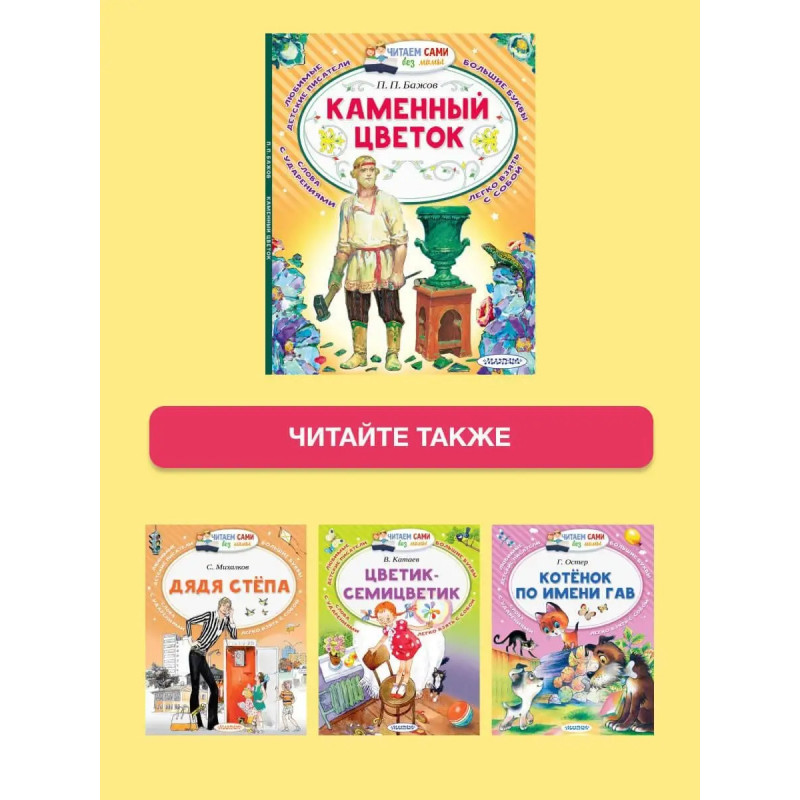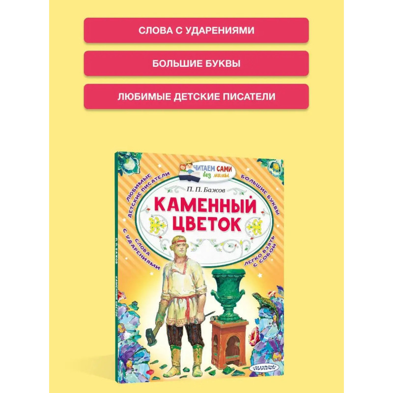 5 причин купить книгу 1. Классический текст с ударениями подходит для первого самостоятельного чтения. 2. В сборник вошёл один из самых известных сказов П. П. Бажова, mustread для каждого культурного человека. 3. Знакомые с детства красочные иллюстрации помогут лучше понять прочитанное. 4. История учит трудолюбию, отваге и дружелюбию. 5. Удобный формат книги, которую можно брать с собой на прогулку или в поездку.