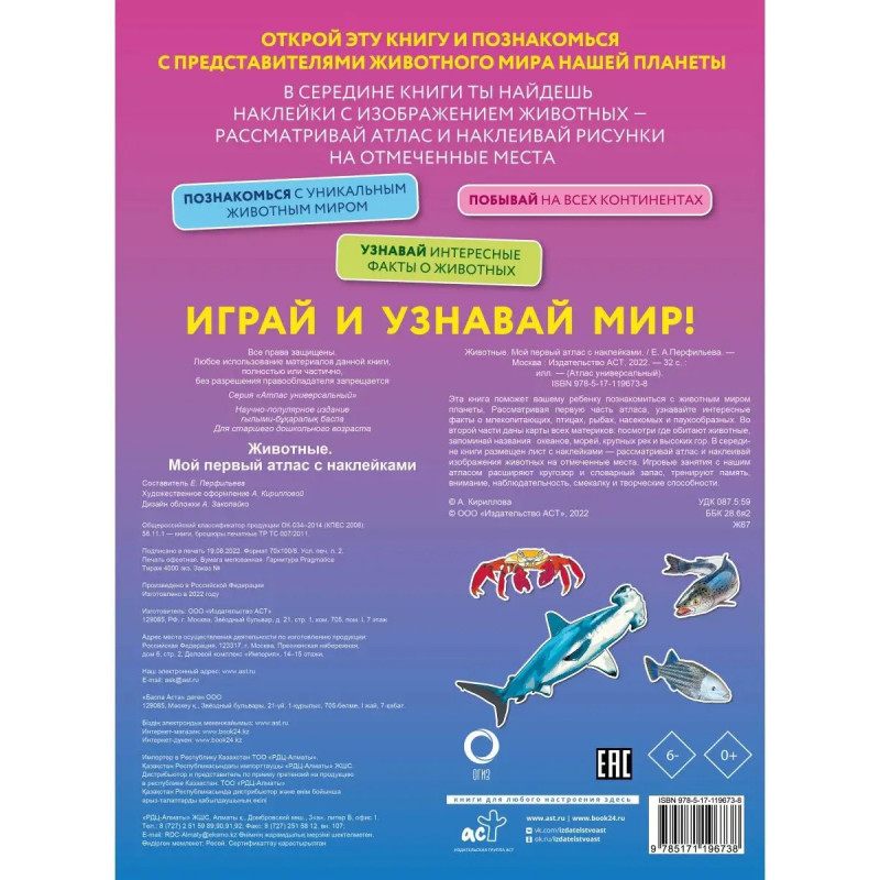 Эта книга поможет вашему ребенку познакомиться с животным миром планеты. Рассматривая первую часть атласа узнавайте интересные факты о млекопитающих, птицах, рыбах, насекомых и паукообразных. Во второй части даны карты всех материков: посмотри где обитают животные, запоминай названия океанов, морей, крупных рек и высоких гор. В середине книги размещен лист с наклейками рассматривай атлас и наклеивай изображения животных на отмеченные места. Игровые занятия с нашим атласом расширяют кругозор и словарный запас, тренируют память, внимание, наблюдательность, смекалку и творческие способности.