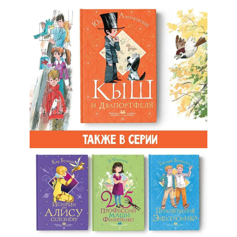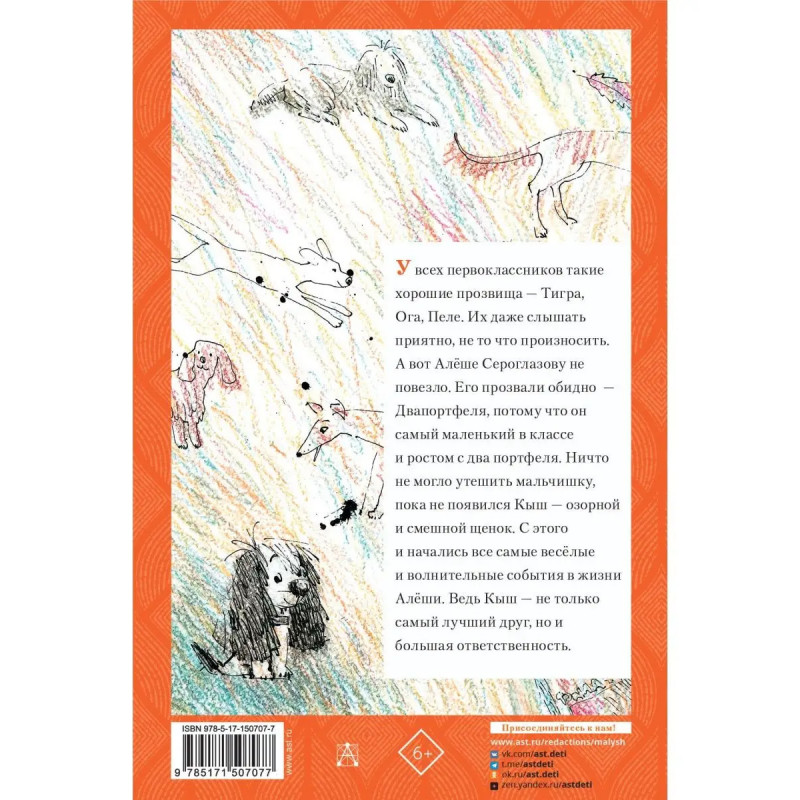 У всех первоклассников такие хорошие прозвища Тигра, Ога, Пеле. Их даже слышать приятно, не то что произносить. А вот Алёше Сероглазову не повезло. Его прозвали обидно Двапортфеля, потому что он самый маленький в классе и ростом с два портфеля. Ничто не могло утешить мальчишку, пока не появился Кыш озорной и смешной щенок. С этого и начались все самые весёлые и тревожные события в жизни Алёши. Ведь Кыш не только самый лучший друг, но и большая ответственность. О приключениях Кыша и Алёши читайте в нашей книжке!