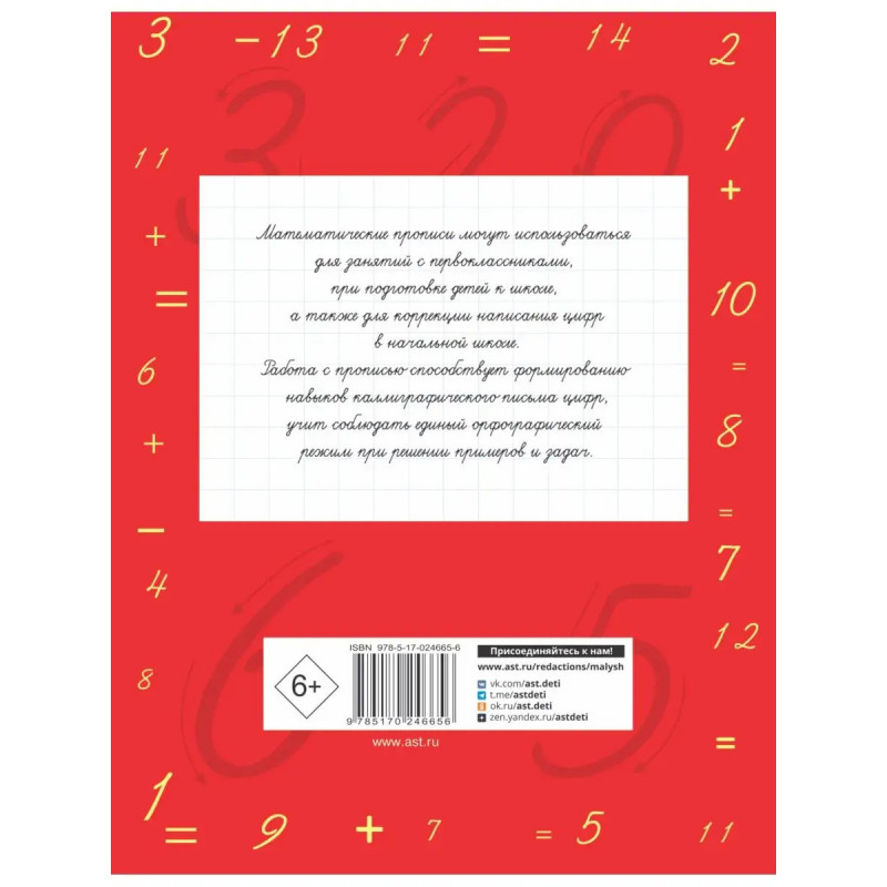 Математические прописи могут использоваться для занятий с первоклассниками, при подготовке детей к школе, а также для коррекции написания цифр в начальной школе. Работа с прописями способствует формированию навыков каллиграфического написания цифр, учит соблюдать единый орфографический режим при решении примеров и задач. Для младшего школьного возраста.О. В. Узорова и Е.А Нефёдова известные педагоги-практики, авторы самых издаваемых учебников и учебных пособий в России. Основанные на авторской методике, доказавшей свою эффективность миллионными тиражами, эти пособия помогут родителям подготовить ребенка к школе, а ученикам легко и эффективно освоить программу начальной школы. Все, что поможет ребенку стать успешным в учёбе, вы найдёте в книгах Узоровой и Нефёдовой.