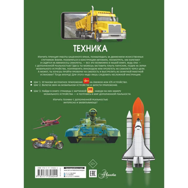 Вы наверняка интересуетесь техникой. И правильно, ведь людям без нее не обойтись. На общественном транспорте мы ездим в школу, в гости к друзьям, в маггазины, а чтобы преодолеть дальние расстояния, пересаживаемся на поезда, самолеты или корабли. С помощью дорожно-строительной техники вырастают города и проходят дороги там, где раньше росли необходимые леса. А с помощью космической техники человек покоряет космос. Есть и еще один вид техники - боевой. Она стоит на страже мира и порядка. Полистайте страницы нашей гигантской энциклопедии, и вы познакомитесь поближе с разными видами техники. Причем сможете не только увидеть все это на наших красочных иллюстрациях и прочесть описания, но и детально рассмотреть в объеме и движении. Разобраться, как работает нефтедобывающая платформа, увидеть своими глазами, как произошло крушение "Титаника", запустить ракету в космос, управлять танком и самолетом - это и многое другое станет доступно вам с нашей гигантской 3D-энциклопедией с дополненной реальностью. И всем этим буд