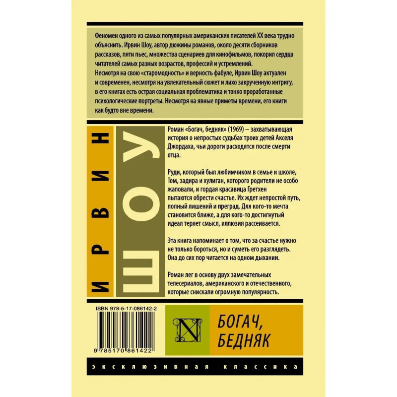 Роман "Богач, бедняк" (1969) захватывающая история о непростых судьбах троих детей Акселя Джордаха, чьи дороги расходятся после смерти отца. Руди, который был любимчиком в семье и школе, Том, задира и хулиган, которого родители не особо жаловали, и гордая красавица Гретхен пытаются обрести счастье. Их ждет непростой путь, полный лишений и преград. Для кого-то мечта становится ближе, а для кого-то достигнутый идеал теряет смысл, иллюзия рассеивается. Эта книга напоминает о том, что за счастье нужно не только бороться, но и суметь его разглядеть. Она до сих пор читается на одном дыхании. Роман лег в основу двух замечательных телесериалов, американского и отечественного, которые снискали огромную популярность.