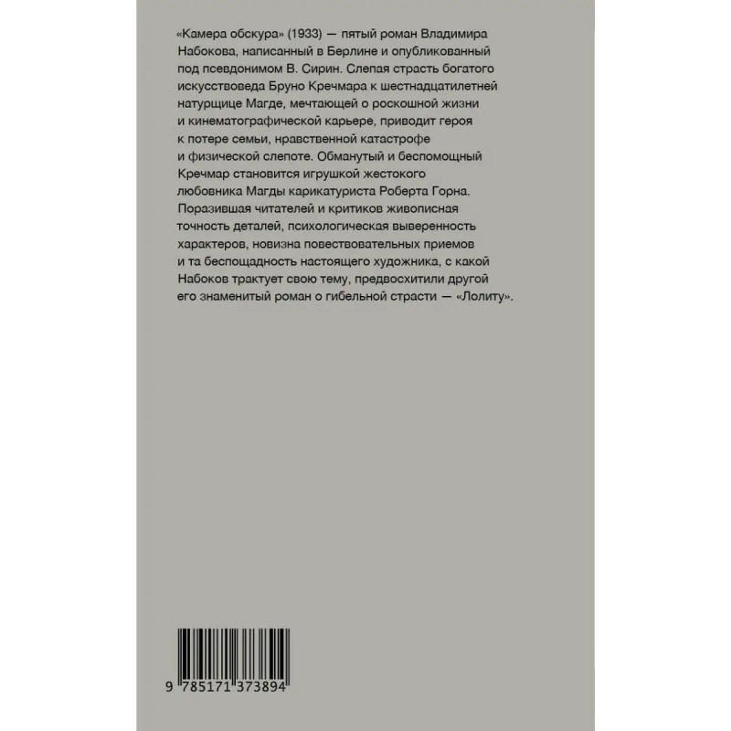 Как бы ни было прекрасно изображение в камере обскура это лишь перевернутая картинка реального мира. Великий роман Набокова, многие идеи которого получили развитие в написанной им двадцать два года спустя "Лолите". Одной из ключевых для этого романа является тема отображения жизни. А одно из главных средств отображения жизни искусство, и прежде всего, раз речь идет о XX веке, кинематограф. Искусствовед Бруно Кречмар, преуспевающий знаток живописи и респектабельный глава семейства, встречает в зале кинотеатра Магду Петерс, бедную молодую девушку, подрабатывающую билетершей и мечтающую о карьере актрисы. Вспыхнувшая в нем страсть кажется глотком свежего воздуха, единственным реальным чувством в мире вечной лжи, догм, условностей и правил. Но, на самом деле, это лишь иллюзия, искривленное и перевернутое изображение реальности в камере обскура. И за это знание Бруно придется заплатить слишком большую цену. Эпоха великих иллюзий дарит безграничные возможности для созерцания и фантазии, но рано или поздно в