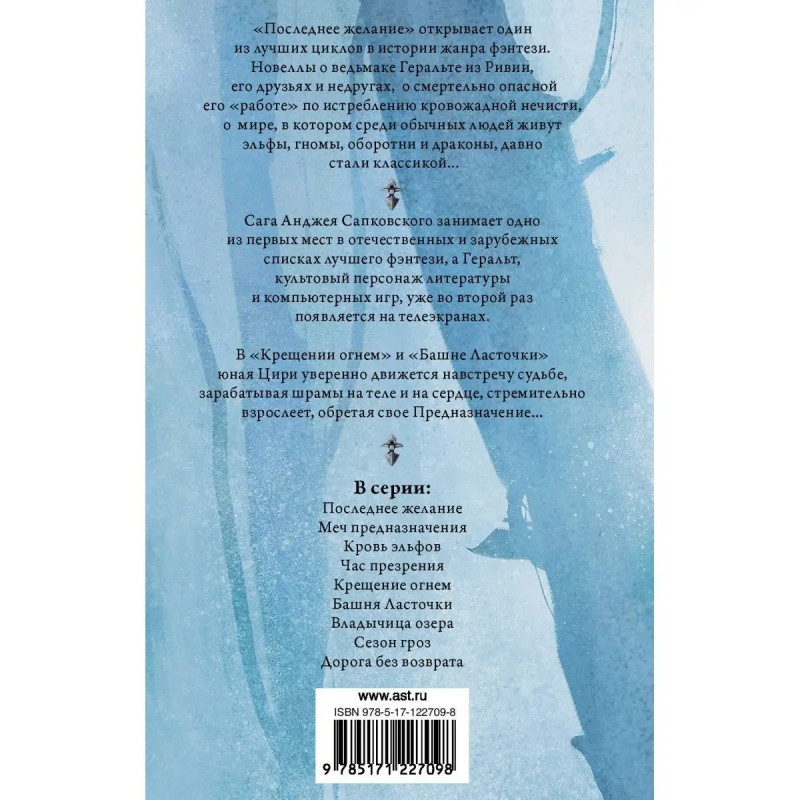 Новеллы о ведьмаке Геральте из Ривии, его друзьях и недругах, о смертельно опасной его "работе" по истреблению кровожадной нечисти, о мире, в котором среди обычных людей живут эльфы, гномы, оборотни и драконы, давно стали классикой... Сага Анджея Сапковского занимает одно из первых мест в отечественных и зарубежных списках лучшего фэнтези, а Геральт, культовый персонаж литературы и компьютерных игр, уже во второй раз появляется на телеэкранах. В "Крещении огнем" и "Башне Ласточки" юная Цири уверенно движется навстречу судьбе, зарабатывая шрамы на теле и на сердце, стремительно взрослеет, обретая свое Предназначение