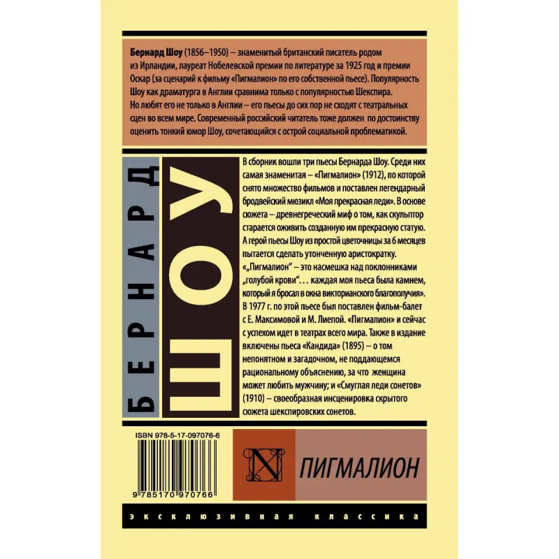 В сборник вошли три пьесы Бернарда Шоу. Среди них самая знаменитая - "Пигмалион" (1912 г.), по которой снято множество фильмов и поставлен легендарный бродвейский мюзикл "Моя прекрасная леди". В основе сюжета - древнегреческий миф о том, как скульптор старается оживить созданную им прекрасную статую. А герой пьесы Шоу из простой цветочницы за 6 месяцев пытается сделать утонченную аристократку. "Пигмалион это насмешка над поклонниками "голубой крови" каждая моя пьеса была камнем, который я бросал в окна викторианского благополучия", - говорил Шоу. В 1977 г. по этой пьесе был поставлен фильм-балет с Е. Максимовой и М. Лиепой. "Пигмалион" и сейчас с успехом идет в театрах всего мира. Также в издание включены пьеса "Кандида" (1895 г.) о том непонятном и загадочном, не поддающемся рациональному объяснению, за что женщина может любить мужчину; и "Смуглая леди сонетов" (191 г.) своеобразная инсценировка скрытого сюжета шекспировских сонетов.