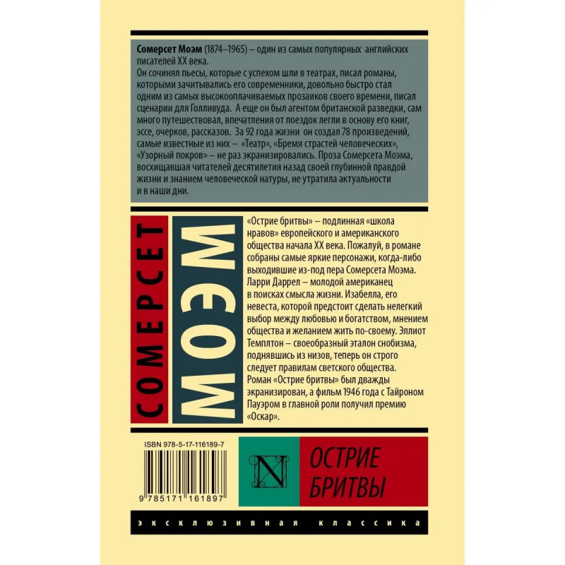 "Острие бритвы" подлинная "школа нравов" европейского и американского общества начала XX века. Пожалуй, в романе собраны самые яркие персонажи, когда-либо выходившие из-под пера Сомерсета Моэма. Ларри Даррел молодой американец в поисках смысла жизни. Изабелла, его невеста, которой предстоит сделать нелегкий выбор между любовью и богатством, мнением общества и желанием жить по-своему. Эллиот Темплтон своеобразный эталон снобизма, поднявшись из низов, теперь он строго следует правилам светского общества. Роман "Острие бритвы" был дважды экранизирован, а фильм 1946 года с Тайроном Пауэром в главной роли получил премию "Оскар".
