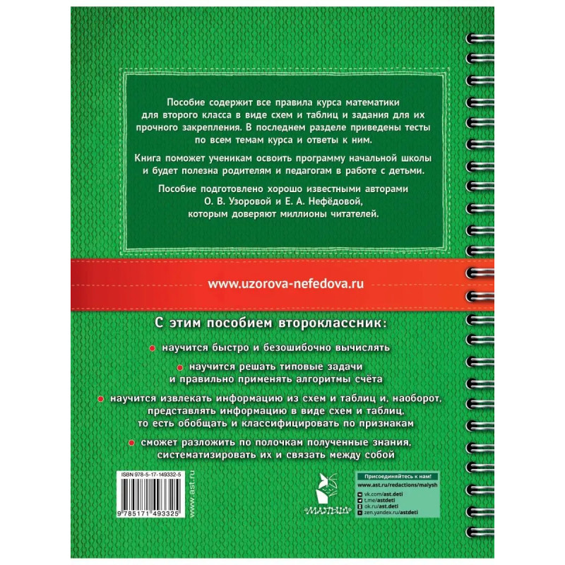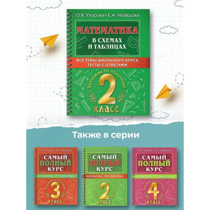 Хотите помочь ребёнку лучше учиться и систематизировать свои знания?Это пособие содержит все правила курса математики для второго класса в виде схем и таблиц и задания для их прочного закрепления. В последнем разделе приведены тесты по всем темам курса и ответы к ним. Пособие составлено экспертами детского образования, которым доверяют миллионы О.В. Узоровой и Е.А. Нефёдовой.С этим пособием второклассник быстро освоит алгоритмы счёта и решения типовых задач, научится извлекать информацию из схем и таблиц и, наоборот, представлять информацию в виде схем и таблиц. Ребёнок сможет разложить по полочкам полученные знания, систематизировать их и связать между собой.Помогите ребёнку ходить в школу с радостью!