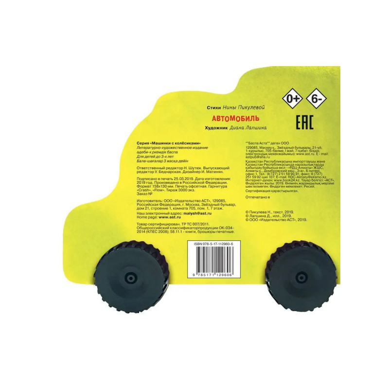 - Необычная игровая форма книги с пластиковыми колёсиками, как у настоящих игрушечных машинок; - Комплексное развитие интеллекта ребенка с самых первых дней развитие мелкой моторики, внимания, координации движений, хватательного рефлекса и тактильных навыков, - 12 страничек на плотном картоне, который не согнется и не порвется, с фигурной вырубкой, специально для маленьких пальчиков; - яркие очаровательные картинки современной талантливой художницы Дианы Лапшиной привлекут внимание малышей; - озорные, мелодичные и легко запоминающиеся стихи Нины ВасильевныПикулевой обязательно понравятся даже самым маленьким читателям.