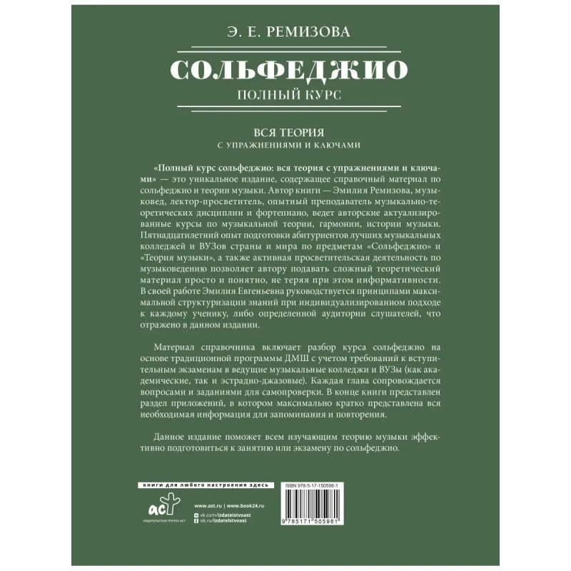 Полный курс сольфеджио: вся теория с упражнениями и шпаргалками" - удобное справочное издание, содержащее в себе объяснение всех тем по теории музыки на основе традиционной программы сольфеджио детских музыкальных школ с учетом требований к вступительным экзаменам в ведущие музыкальные колледжи и ВУЗы (как академические, так и эстрадно-джазовые). Материал преподносится максимально доступно и кратко, сопровождается необходимыми примерами и пояснениями. После каждой главы есть вопросы и задания для самостоятельной проверки усвоенного материала. В конце издания располагается глава "Шпаргалка", с помощью которой можно быстро и эффективно освежить материал и использовать информацию в качестве подсказок. Издание подойдет всем, кто изучает теорию музыки, а также поможет подготовиться к занятиям или экзаменам по сольфеджио.