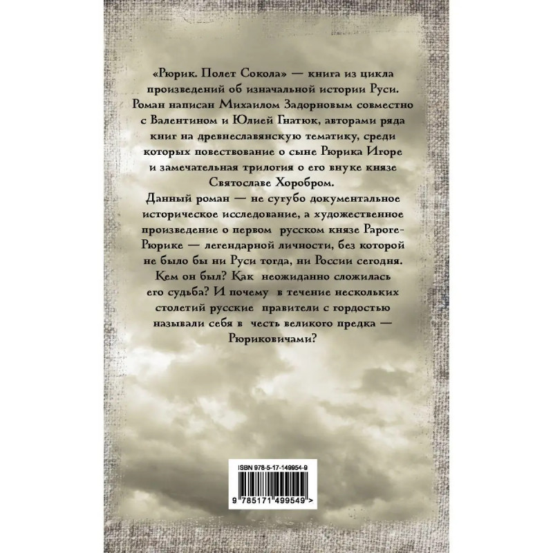 "Рюрик. Полет Сокола" книга из цикла произведений об изначальной истории Руси. Роман написан Михаилом Задорновым совместно с Валентином и Юлией Гнатюк, авторами ряда книг на древнеславянскую тематику, среди которых повествование о сыне Рюрика Игоре и замечательная трилогия о его внуке князе Святославе Хоробром. Фишки книги "Рюрик. Полет Сокола": - Уникальные исторические факты про правление Рюрика. - Факты, описанные в книге, в школьной программе не упоминаются. - Интересна для углубленного понимания истории славян. Для тех, кто любит историю и эту эпоху. Данный роман не сугубо документальное историческое исследование, а художественное произведение о первом русском князе Рароге-Рюрике легендарной личности, без которой не было бы ни Руси тогда, ни России сегодня. Кем он был? Как неожиданно сложилась его судьба? И почему в течение нескольких столетий русские правители с гордостью называли себя в честь великого предка Рюриковичами? У книги "Рюрик. Полет Сокола" очень удобный компактный формат с мяг