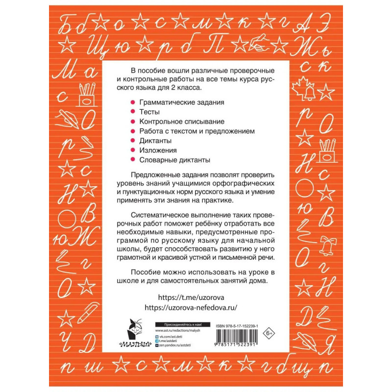 Задания пособия позволят проверить уровень знаний учащимися орфографических и пунктуационных норм русского языка, умение применять эти знания на практике, а также поможет ребёнку в освоении школьной программы. В одной книге собраны различные проверочные и контрольные работы на все темы курса русского языка для 2 класса: грамматические задания, тесты, тексты для контрольного списывания, задания по работе с текстом и предложением, диктанты, изложения, словарные диктанты.О. В. Узорова и Е.А Нефёдова известные педагоги-практики, авторы самых издаваемых учебников и учебных пособий в России. Основанные на авторской методике, доказавшей свою эффективность миллионными тиражами, эти пособия помогут родителям подготовить ребенка к школе, а ученикам легко и эффективно освоить программу начальной школы.