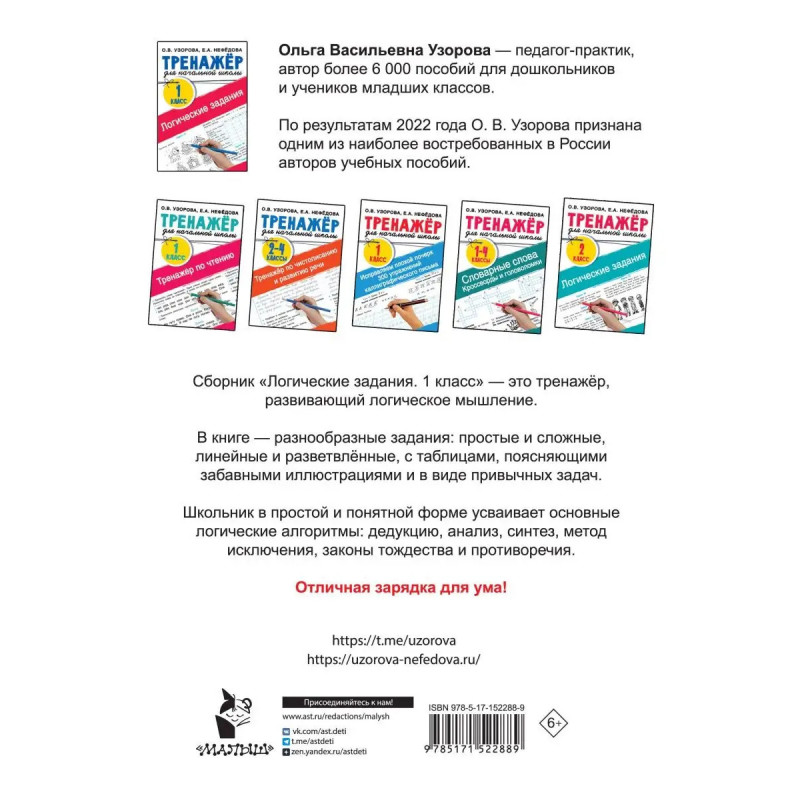 Ольга Васильевна Узорова известный педагог-практик, автор более 6 000 книг для дошкольников и учеников младших классов. По результатам 2022 года О. В. Узорова признана одним из наиболее востребованных в России авторов учебных пособий.Сборник Логические задания для 1 класса это тренажёр, развивающий логическое мышление. Книга содержит разнообразные задания: простые и сложные, линейные и разветвлённые, с таблицами, поясняющими забавными иллюстрациями и в виде привычных задач. Незаметно для себя первоклассник в простой и понятной форме постигает основные логические алгоритмы: дедукцию, анализ, синтез, метод исключения, законы тождества и противоречия.Пусть ребёнок учится легко!