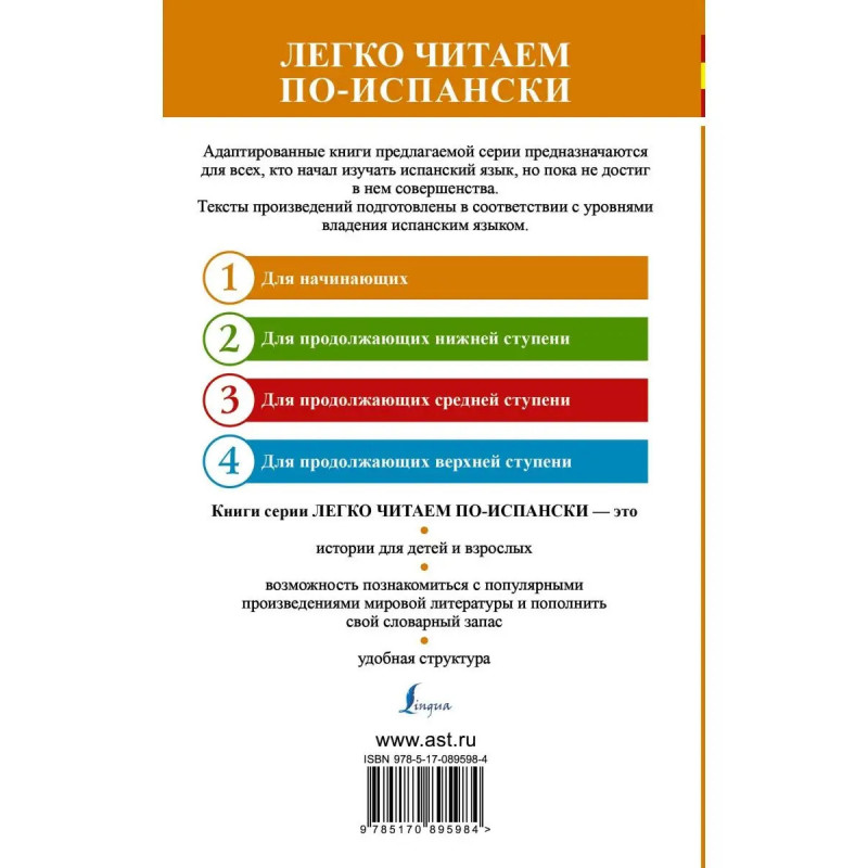 Предлагаем вашему вниманию книги серии Легко читаем по-испански. Наши увлекательные адаптированные книги на испанском языке содержат комментарии, упражнения на проверку понимания прочитанного, а также небольшой словарь. В серии Легко читаем по-испански вы найдете лучшую классику на испанском языке, сможете познакомиться с популярными произведениями мировой литературы на языке оригинала. Остроумные, занимательные испанские сказки позволят вам погрузиться в удивительный мир испанского фольклора. Чтение испанских сказок в оригинале - лучший способ выучить язык легко и с удовольствием, а также познакомиться с культурой Испании. Предназначается для начинающих изучать испанский язык (уровень 1 - для начинающих). Незначительно адаптированная для удобства читателя книга на испанском языке сопровождается комментариями, разными видами упражнений и кратким словарем.