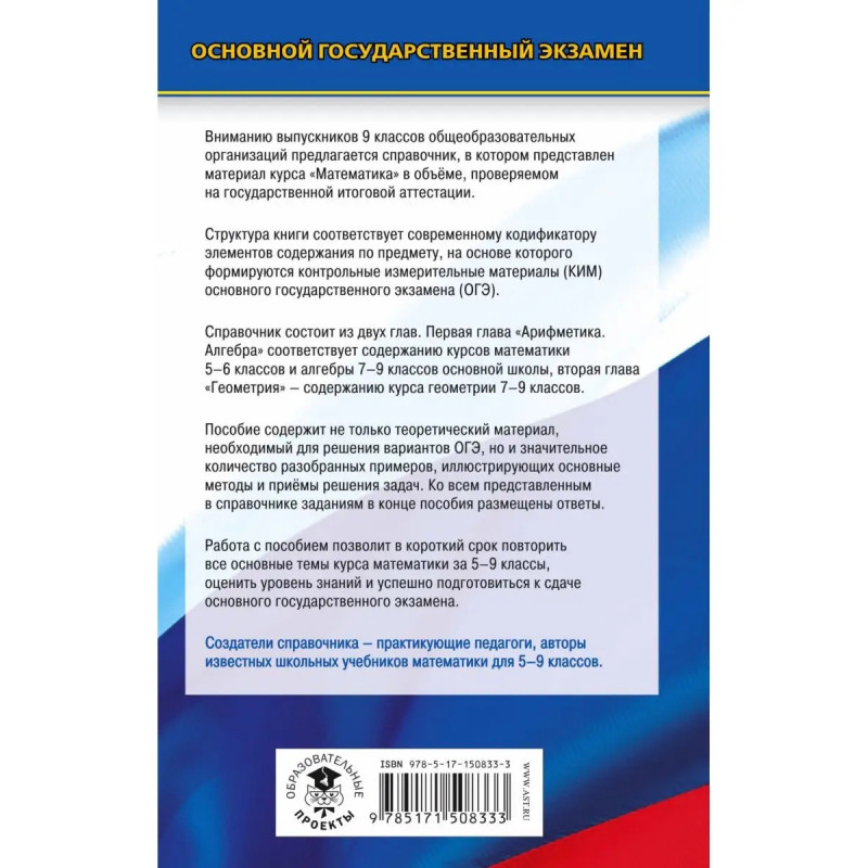 Вниманию выпускников 9 классов общеобразовательных организаций предлагается справочник, в котором представлен материал курса Математика в объёме, проверяемом на основном государственном экзамене. Структура книги соответствует современному кодификатору элементов содержания по предмету, на основе которого формируются экзаменационные задания контрольные измерительные материалы ОГЭ. Справочник состоит из двух глав. Первая глава Арифметика. Алгебра соответствует содержанию курсов математики 56 классов и алгебры 79 классов основной школы, вторая глава Геометрия содержанию курса планиметрии 79 классов. Пособие содержит не только теоретический материал, необходимый для решения вариантов ОГЭ, но и значительное количество разобранных примеров, иллюстрирующих основные методы и приёмы решения задач. Ко всем заданиям в конце пособия даны ответы для самопроверки. Работа с пособием позволит в короткий срок повторить все основные темы курса математики за 59 классы, оценить уровень знаний и успешно подготовиться
